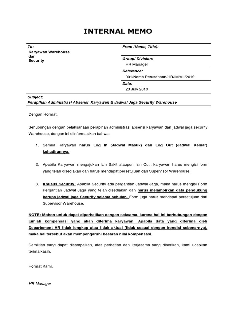 1.6.3 contoh memo internal perusahaan. Contoh cara membuat surat pemberitahuan. Dalam pengambilan sebuah keputusan ataupun mengenai evaluasi sesuatu hal memo biasanya digunakan untuk keperluan komunikasi internal, seperti dalam sebuah perusahaan, sebuah instansi pemerintahan, lembaga, maupun organisasi. Dan tanpa ada kabar atau pemberitahuan maka karyawan/karyawati tersebut dianggap mengundurkan diri. Contoh memo format dan non formal: